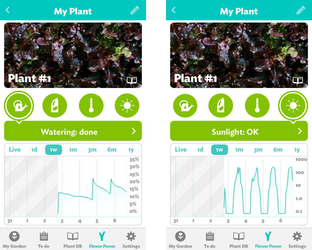 You can then go into the My Plant section to see data such as watering, sunshine and temperature on a graph…and to be even more freaky, you can go into live mode, and receive data as it happens!